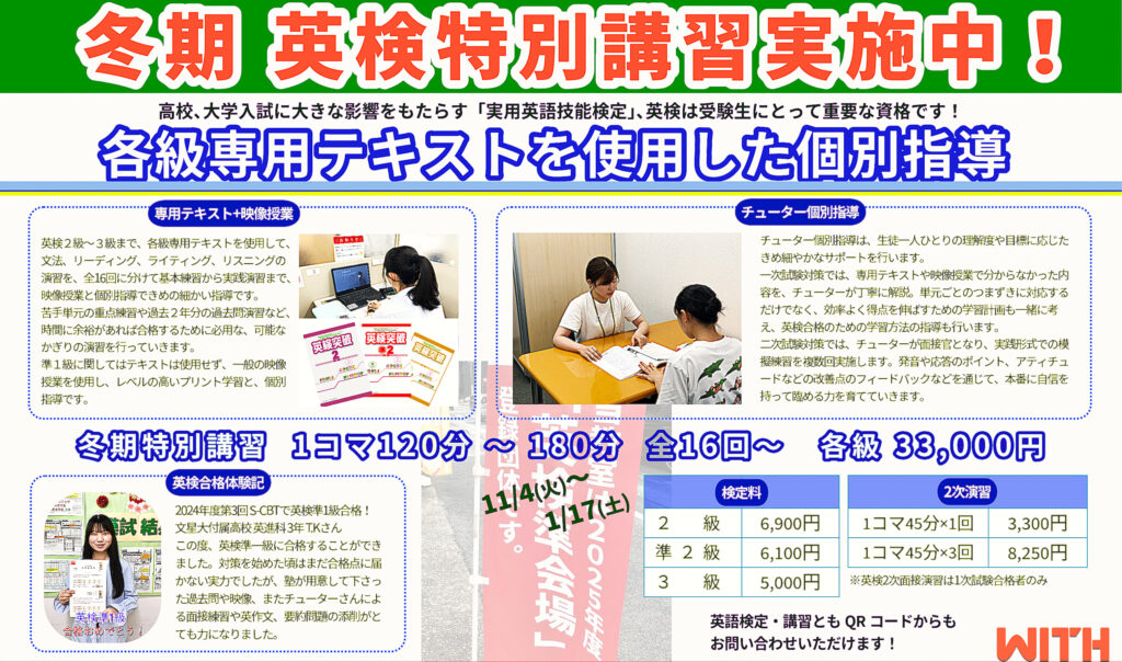 英検2級~3級まで、各級専用テキストを使用して、文法・リーディング・ライティング・リスニングの演習を、全16回に分けて基本練習から実践演習まで、映像授業と個別指導できめの細かい指導です。苦手単元の重点練習や過去2年分の過去問演習など、時間に余裕があれば合格するために必要な、可能なかぎり演習を行いっていきます。